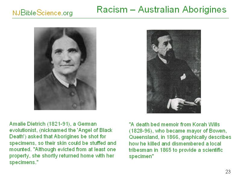 Amalie Dietrich, a German evolutionist, (nicknamed the 'Angel of Black Death') asked that Aborigines be shot for specimens, so their skin could be stuffed and mounted. "Although evicted from at least one property, she shortly returned home with her specimens."
