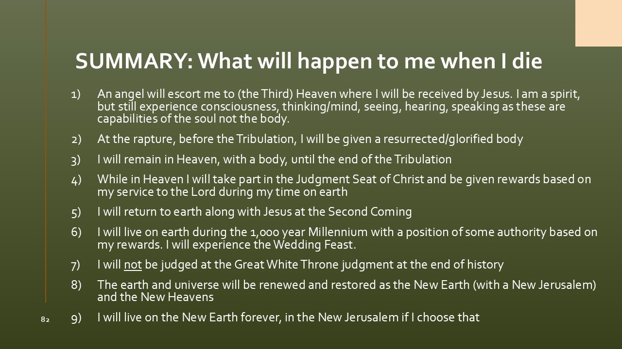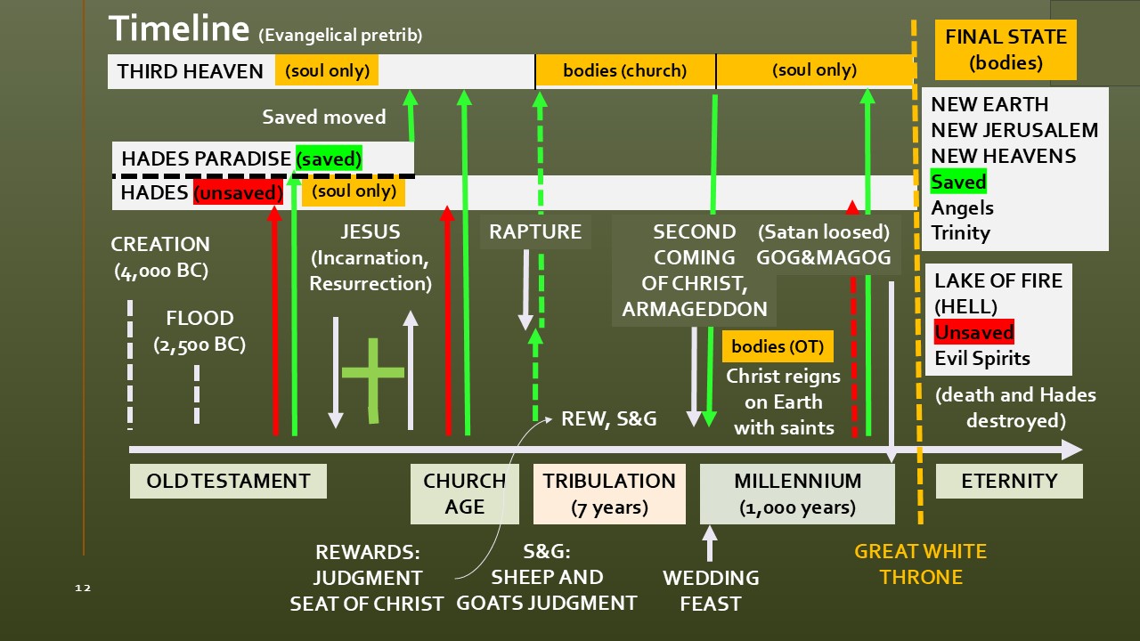 An overview of the biblical history timeline through the end times, including what Heaven will be like for us (focused on the evangelical pre-trib viewpoint).