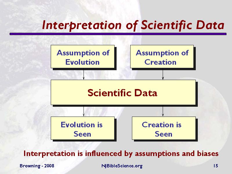 The traits of the competing models as given on the previous slide are quite different and it would seem a simple matter to resolve which model is true. The problem is that scientific data can in most cases be interpreted in different ways. Scientists like to portray themselves as impartial, but in fact we all have biases and make underlying assumptions. Depending upon whether you are starting with an assumption that evolution must be true, or creation must be true, the same scientific data will frequently yield interpretations which support either evolution or creation. This is why the same “fossil record” (or the “geologic column”) is touted both by evolutionists as proof of evolution (supposedly showing an increase in complexity of animals over time), and at the same time, by creationists as proof that evolution never occurred (showing abrupt appearance with no transitions). People also arrive at differing conclusions about something like the geologic column because it is a complex phenomenon, with many considerations needing to be taken into account, requiring much specialized knowledge. Many times our knowledge is also incomplete and the gaps must be filled via speculation, often confused with scientific fact by the unaware.