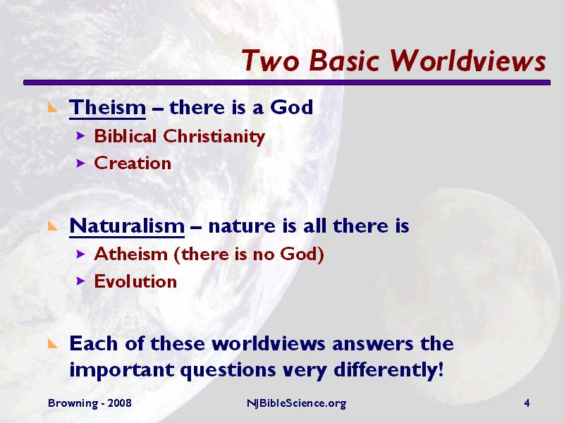 There are ultimately only two basic worldviews – theism and naturalism, there is a God or there is not a God. A fundamental part of naturalism is the idea of “evolution”, that some purely natural process has formed the universe, its structures, and all living things.