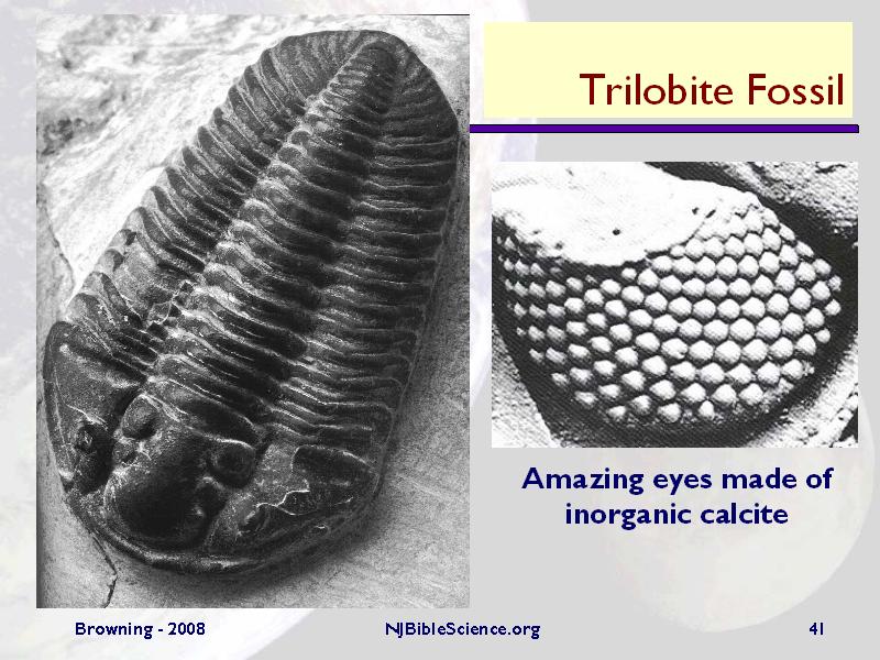 Here is a picture of one of the creatures found in the Cambrian explosion – a trilobite. Many thousands of fossils of fully-formed trilobites are found without a trace of simpler ancestors. And these creatures are not simple by any definition. In fact, the eye of the trilobite is very complex and unique, being made of inorganic calcite.