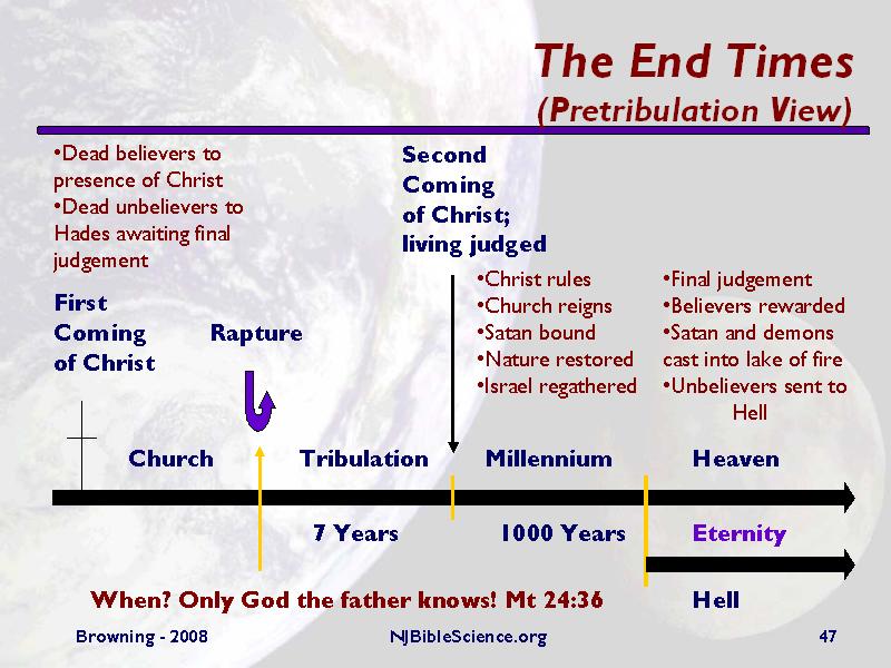 This chart highlights the main events and timeframes of the end times, according to the most commonly held pretribulation view.