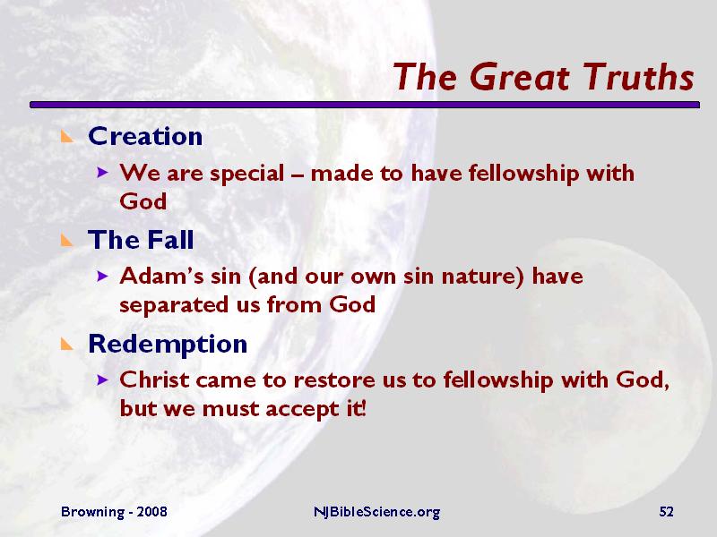 The “great truths” of the Bible are summarized: God created the heavens and the earth as a home for people with whom He could have fellowship with. Our sin has separated us from God, but He has made a way of restoration, namely, to trust in Jesus as Lord and Savior.