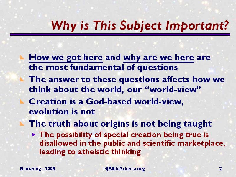 The subject of origins is important because “how we got here” is the most fundamental question that can be asked. “Why we are here” is a question science cannot answer, but which is just as important. How we answer these questions for ourselves provides the basis for how we think about the world - it defines our “world-view”. The belief that people were created by God, in the “image of God”, is at the heart of “creationism”. The belief that people now exist because of a long string of random chance events is one of the tenets of “naturalism”, of which “evolution” is a part. Naturalism is the idea that “nature is all there is”, there is no supernatural. Even though some evolutionary scientists profess belief in God, evolution has no need of Him. It is obvious that these two ideas are opposed to each other, and that only one can be true - either God exists and He created us, or we are a product of time and chance.