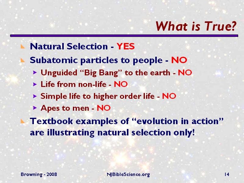 Building on the distinction between micro and macro-evolution, this chart summarizes “what is true”. Natural selection leading to variation is true. However, it DOES NOT FOLLOW, and there is little evidence for, extending or extrapolating the truth of natural selection to say that a “subatomic particles to people” evolutionary scenario is therefore true. But this is what usually takes place. An example of so-called micro-evolution is presented, and the viewer is lead to believe that by inference the entire naturalistic scenario is therefore true. What starts as scientific fact turns seamlessly into theory and then wild speculation without the viewer being told that a corner has been turned and huge gaps crossed!