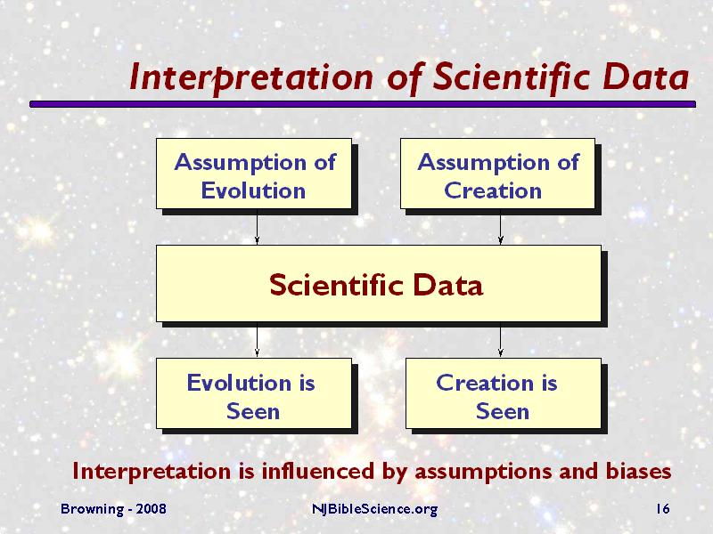 The traits of the competing models as given on the previous slide are quite different and it would seem a simple matter to resolve which model is true. The problem is that scientific data can in most cases be interpreted in different ways. Scientists like to portray themselves as impartial, but in fact we all have biases and make underlying assumptions. Depending upon whether you are starting with an assumption that evolution must be true, or creation must be true, the same scientific data will frequently yield interpretations which support either evolution or creation. This is why the same “fossil record” (or the “geologic column”) is touted both by evolutionists as proof of evolution (supposedly showing an increase in complexity of animals over time), and at the same time, by creationists as proof that evolution never occurred (showing abrupt appearance with no transitions). People also arrive at differing conclusions about something like the geologic column because it is a complex phenomenon, with many considerations needing to be taken into account, requiring much specialized knowledge. Many times our knowledge is also incomplete and the gaps must be filled via speculation, often confused with scientific fact by the unaware.