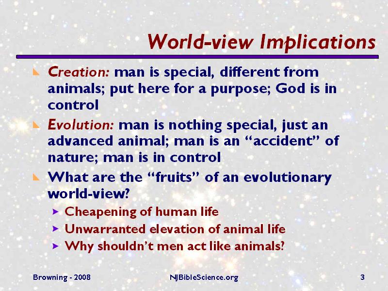 These two world-views of creation and evolution say very different things about who we are, why we are here, and who is ultimately in control. These two different outlooks tend to lead to radically different behaviors. If we teach that people are nothing but “higher animals”, then we shouldn’t be surprised when they act like animals, and the value of human life is discounted and the value of animal life is improperly inflated. Hitler and others have justified their evil actions based on evolutionary thinking (“the survival of the fittest”). Evolutionary scientists do not of course condone these actions, but it IS where this type of philosophy has led. Naturalism has no ground on which absolute morals can be based and leads to relativistic thinking. Evolution provides no explanation for why our inner sense of moral values should even exist.
