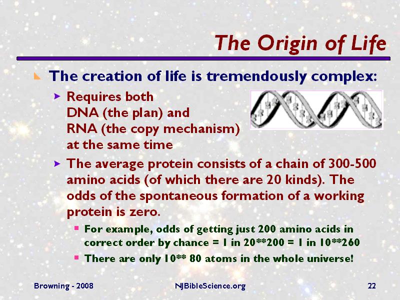 The complexity of life is daunting, as a simple calculation of the odds for forming a working protein by chance in a hypothetical bath of amino acids shows. This level of complexity was vividly described by Fred Hoyle, proponent and defender of the steady-state theory of the universe, who said that a living organism emerging by chance from a pre-biotic soup is about as likely as “a tornado sweeping through a junkyard might assemble a Boeing 747 from the materials therein.”