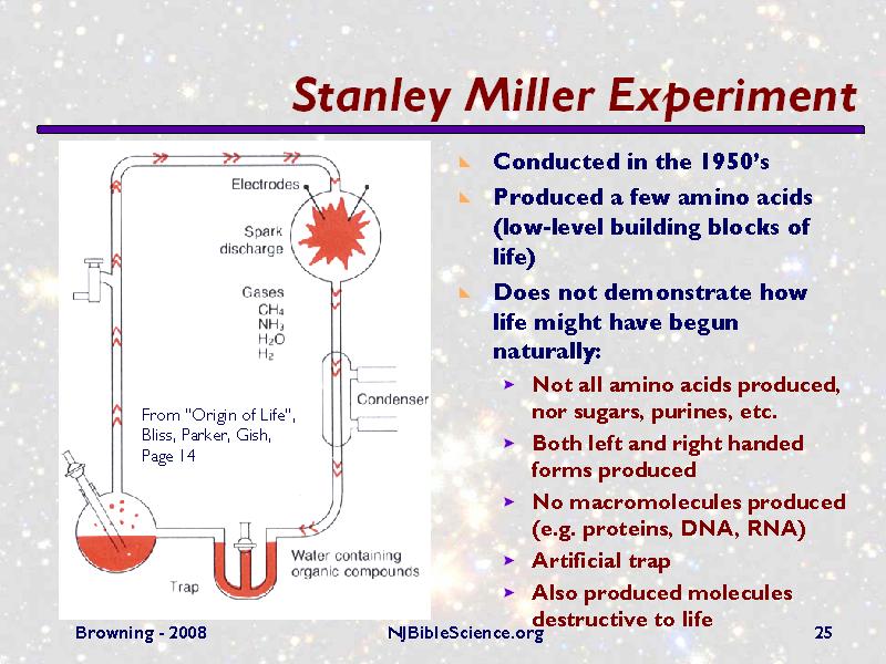 Another famous area of evolutionary experimentation has been in trying to produce life (or at least the precursors of life) from chemicals. It is interesting that the most widely referenced chemical evolution experiment found in textbooks today is still the Stanley Miller experiment from the 1950’s. Evidently not much progress has been made in the last 50 years! However, this experiment produced only a few amino acids, and had many problems associated with it, some of which are given on the slide.