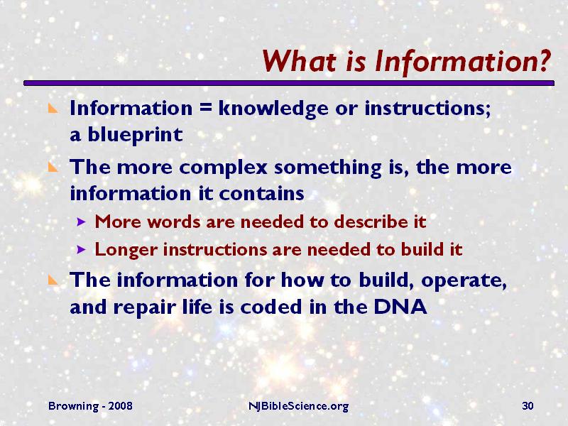 At this point a very important idea needs to be introduced – the DNA physically houses or contains the information of life, but it is not the information itself! An analogy here is in order. For example, this presentation contains information – words and ideas that convey meaning to the reader for a purpose. However, the information (this presentation) can be physically housed or represented in many different ways: on a CD, on a diskette, on a computer hard drive, printed on pages of paper, or viewed on a projection screen. In all of these cases the information is the same, so we can see that the information itself and its physical representation are two different things. However, this is not commonly understood, and most people think of the DNA and the information of life as one and the same. They therefore incorrectly think that altering the physical representation (mutating the DNA) can produce new information. The truth is that the information of life came from the mind of God, but is physically housed as codes in the DNA.