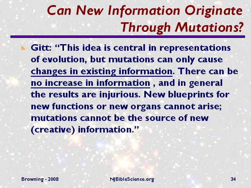 Even though evolutionists posit that mutations can introduce new information, there is not a single documented mutation shown to increase genetic information. In fact, mutations disturb and degrade the existing information, just as changing letters at random in a book will degrade the quality and readability of the book. So-called beneficial mutations, like the loss of wings by birds on isolated islands, allowing them to dive and swim better, represent a loss of information (the information needed for wings in this case).