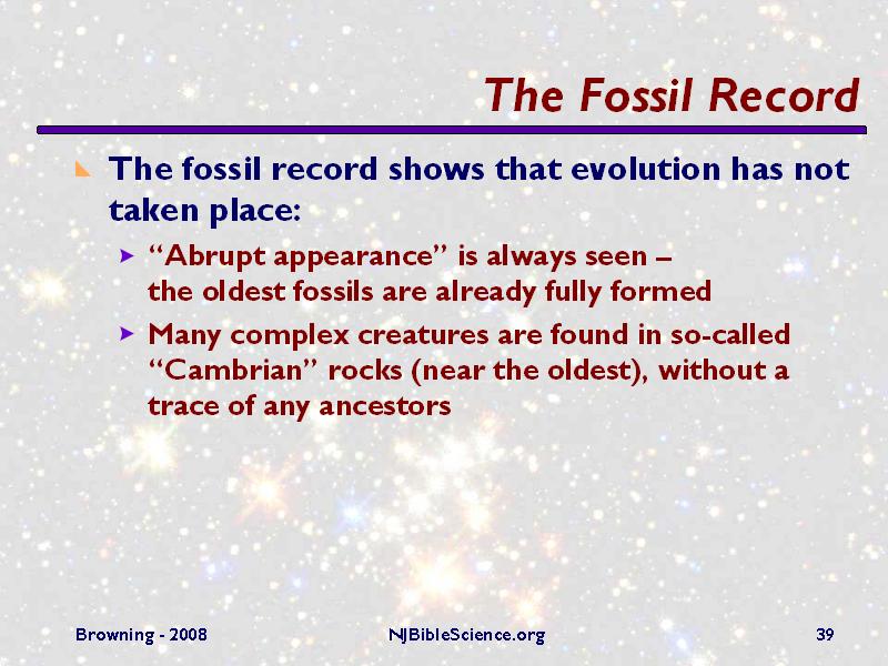 The near-oldest rocks, so-called “Cambrian” rocks, contain many complex creatures, like Trilobites (now extinct). They are fully-formed, and there is not the slightest trace of a more primitive ancestor to be found in the older, “Precambrian” rocks. This period in evolutionary earth history is called the “Cambrian Explosion” because of the vast number of new life forms that appear abruptly.