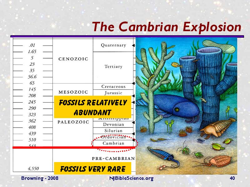 This chart shows how various kinds of living things appear suddenly in the Cambrian period. It is called the “Cambrian explosion” because of the vast variety of invertebrates that are found in these old rocks, without a trace of ancestors in the older rocks below. Most creationists believe this is an artifact of the environments in which these creatures lived being the first buried by the flood. Smarter, more mobile creatures would escape the flood waters longer and be buried later (higher) in the geologic column.