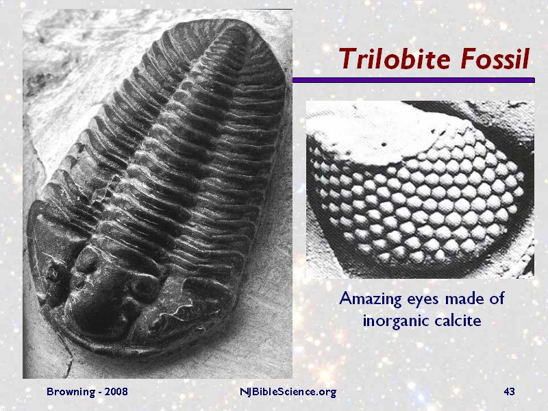 Here is a picture of one of the creatures found in the Cambrian explosion – a trilobite. Many thousands of fossils of fully-formed trilobites are found without a trace of simpler ancestors. And these creatures are not simple by any definition. In fact, the eye of the trilobite is very complex and unique, being made of inorganic calcite.