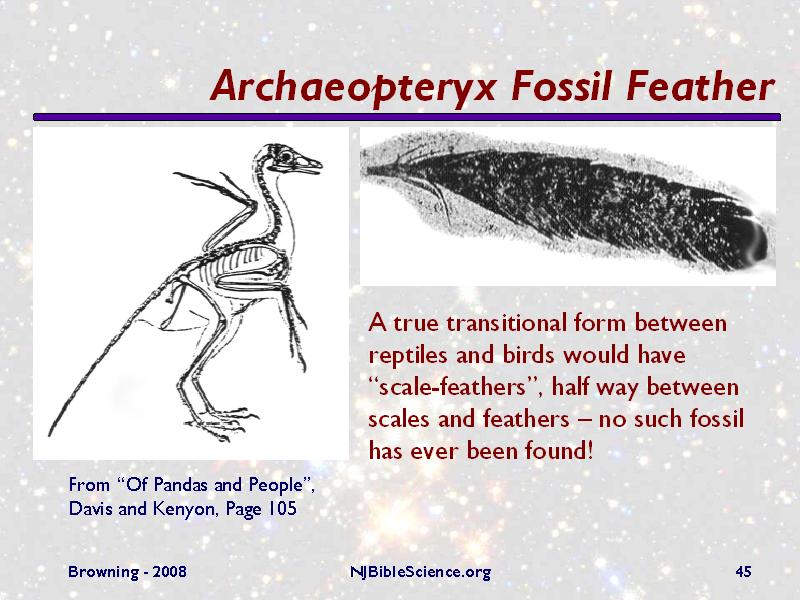As the slide says, a true transitional would have “scale-feathers”, but no such fossil has ever been found! This is odd, given that the transformation from scales to feathers would have been very long, as many changes are needed. Plus, we have very many reptile and bird fossils – what are the chances that all of the intermediate forms have not yet been found? The evolutionist answer is “punctuated equilibrium”, the idea that evolution happens relatively quickly in local areas, thus making it less likely that intermediate fossils will be found.