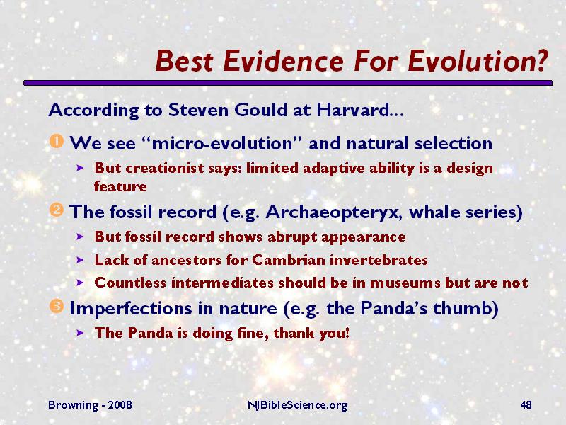 3. So-called “imperfections” in nature are cited. For example, why would God give the Panda bear a thumb that appears to be fairly useless? Or why do men have nipples? One answer is that just because we don’t understand why something is the way it is, doesn’t mean it doesn’t have a good purpose or aesthetic value. This is a weak argument at best.