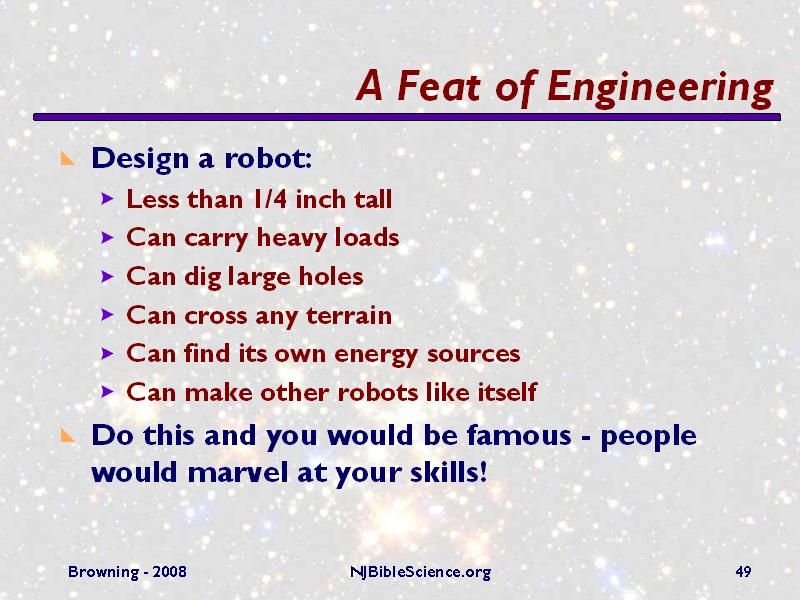 Suppose you were an engineer and were told that your job was to design a robot having the listed specifications. To build such a robot is today beyond our technological capabilities, and if we ever build such a robot, you can sure that a lot of planning and designing will have gone into the effort. People recognize the tremendous intelligence and skill that would be needed to perform such a task.