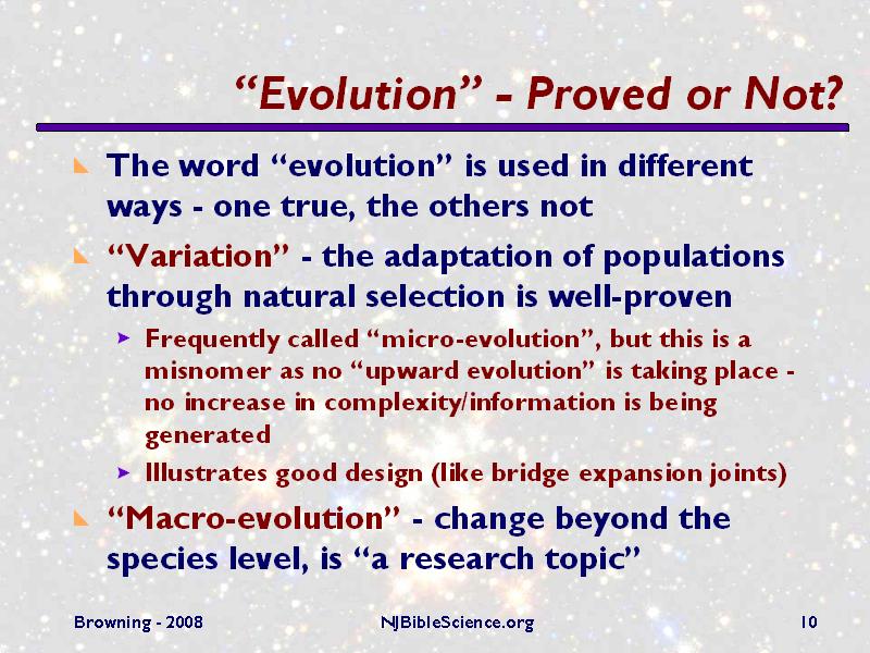 The adaptation of populations through natural selection is well-proven. It is a fact. This is what textbooks and popular shows typically regard as synonymous with “evolution”, but this phenomenon is better labeled “variation within a kind” or “adaptation”. It is frequently called “micro-evolution”, but this is a misnomer. Common “examples of evolution” (like Darwin’s finches) fall into this category. “Speciation”, the formation of non-interbreeding sub-populations, or new “species”, sometimes results. However, CHANGE AT THE SPECIES LEVEL IS UNIMPORTANT in the big picture, as NO INCREASE IN COMPLEXITY (no upward evolution, no increase in genetic information) is taking place.
