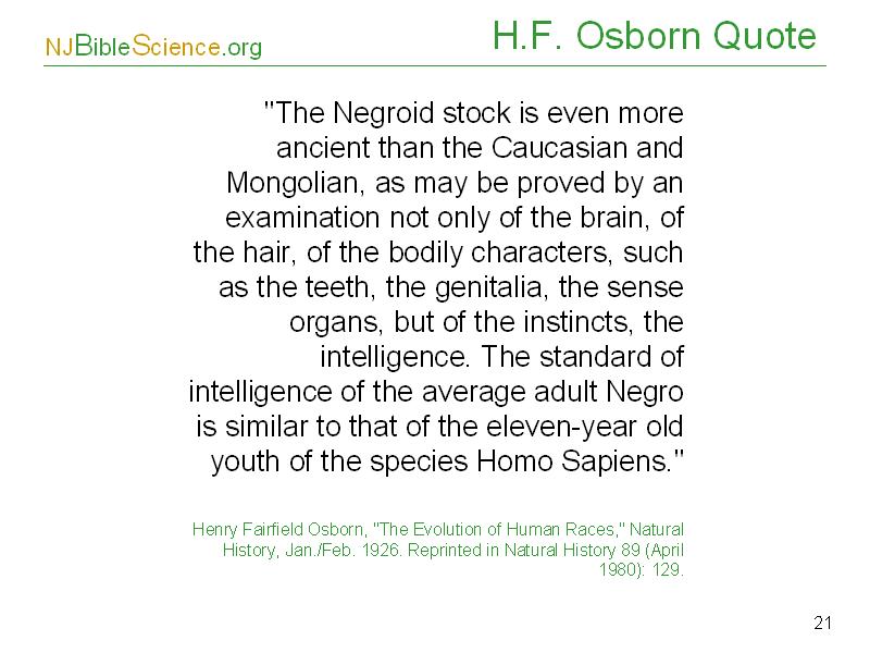 "The Negroid stock is even more ancient than the Caucasian and Mongolian, as may be proved by an examination not only of the brain, of the hair, of the bodily characters, such as the teeth, the genitalia, the sense organs, but of the instincts, the intelligence. The standard of intelligence of the average adult Negro is similar to that of the eleven-year old youth of the species Homo Sapiens."