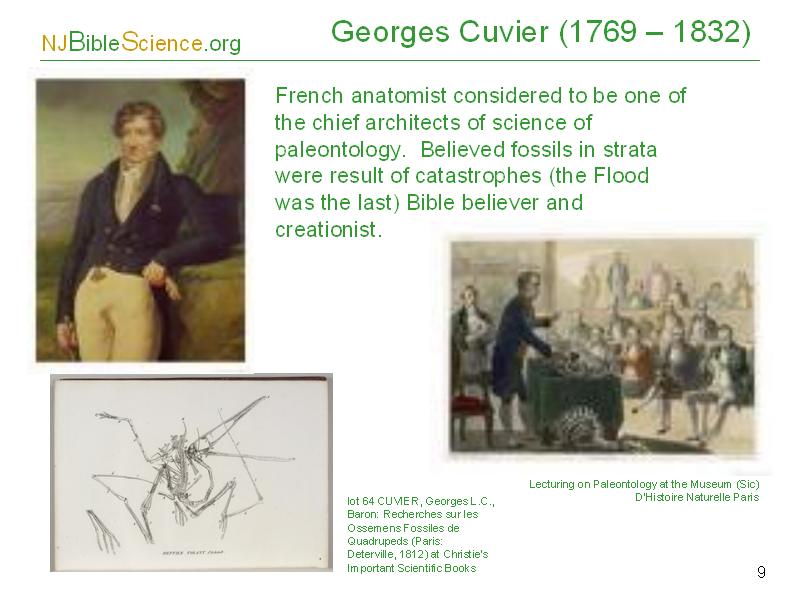 Another Bible believing scientist was Georges Cuvier who was a great French anatomist and considered to be one of the chief architects of the science of paleontology. He believed that different fossils in strata was due to catastrophes, with the Flood being the last in a series. He was a firm creationist and participated (and won) debates in creation vs evolution.