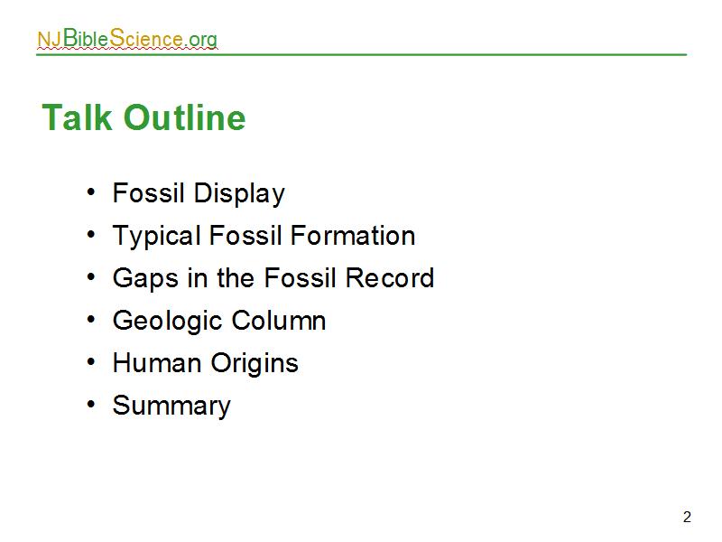 Specifically, I would like to talk about fossils and their relevance to the Creation / Evolution debate. They provide a tangible record of organisms that lived in the past, and they offer a glimpse into a bygone time. At this time, I would like us to examine the fossil display on the table, handle the fossils, play with them, and maybe even drop one or two of them. Then I would like to talk about how they are formed, the a very important issue of gaps, or should I say, missing transitional forms in the fossil record. Next, I would like to talk about the geologic column, a little bit about human origins, since it really requires an entire night in itself. Finally, I would like to summarize what we have learned tonight.