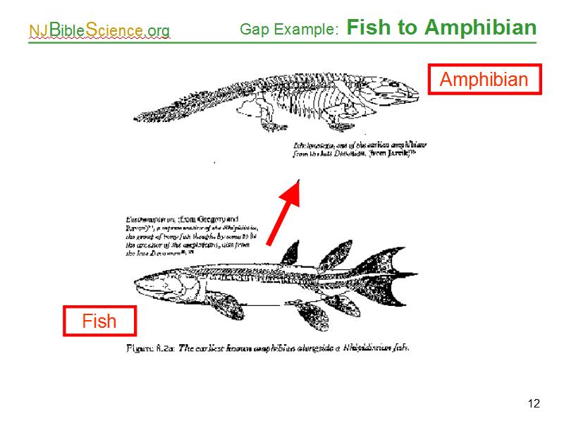 This shows the structurally closest fossilized fish and amphibian. Notice the dramatic jump in the structure. The emergence of a pelvis and jointed back legs. A casual study of these skeletons reveals numerous differences. Consider too that only 10 % of the biology of an organism is found in the skeleton. Even skeletons that look similar may have very different soft tissue anatomy.