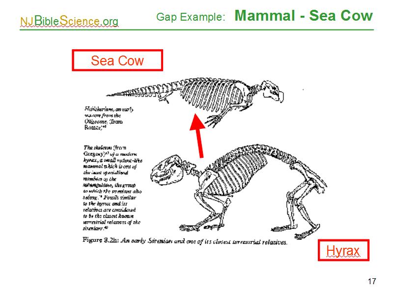 And for our final example, a sea cow. Very different once more. As we have seen, the fossils provide no record of slow evolutionary change (gradualism). These figures were taken from Denton who in turn, reproduced them from a couple of leading textbooks.