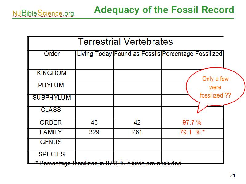 Now back to the quality of the fossil record. Recall that the figures from Denton were of terrestrial vertebrates. Evolutionists often say: fossilization is such a rare event, the fossil record is only sketchy. But look at these percentages of existing fossils. Virtually all Orders are found. That corresponds to the “meat eaters” in the cat example. The majority of Families are found (79.1%). If you excludes birds, that number increases to about 88 %.