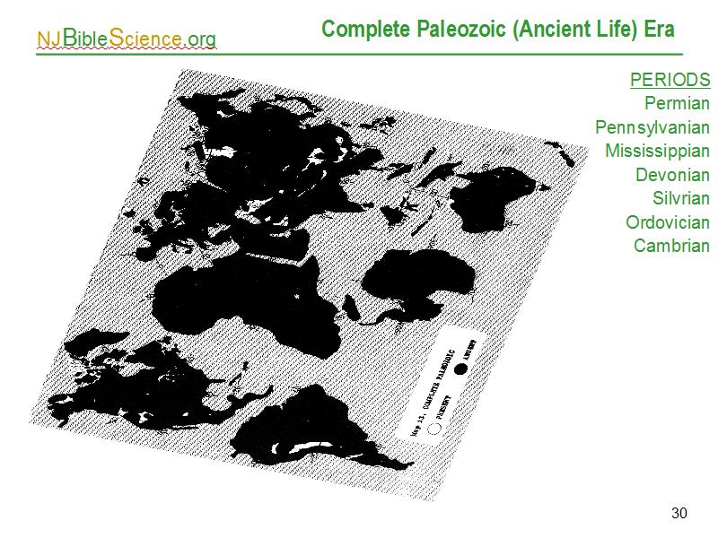 Now, let’s look at the column itself. This map illustrates the land masses of the earth. In white are the land areas where all the periods of the Paleozoic era is found. Notice that there are just some small areas. The “column” is more like a quilt, with patches of different types of fossils.