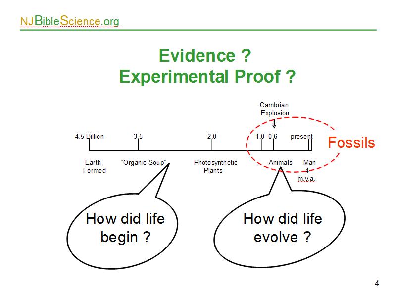 Now, if the concept of evolution is to be compelling science, it should rest on some sort of evidence or experimental proof. To evolve from chemicals to people, we have to address the issues of How did life begin? and How do you go from simple life to more complex forms? Or put another way, how did life evolve, and here’s where fossils come in. They may provide evidence to prove or disprove the concept of evolution.