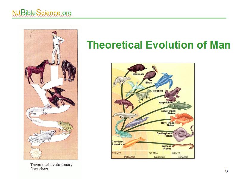 Now just to review, here’s the hypothetical steps to change from single cell organisms to man under the current evolutionary model, as depicted in these two diagrams. You can identify several key stages – First life, fish to amphibians, amphibians to reptiles, reptiles to birds, birds to mammals, and finally to apes to man.