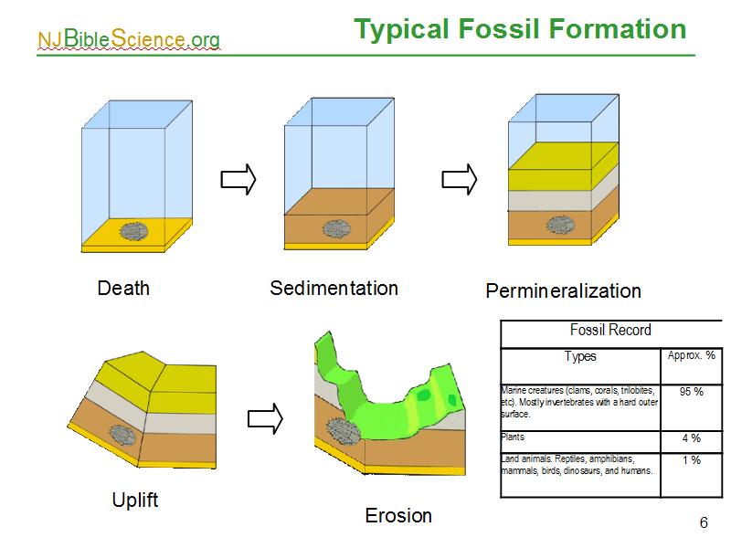 Most fossils are formed by minerals replacing the tissue of dead organisms with a hard minerals. The dead organism, gets buried and is thus protected from decay, and a process of “permineralization” takes place. Subsequent to fossil formation, the strata may be uplifted, or eroded, until found. Notice that the process requires water, consistent with a flood, and burial, consistent with a catastrophe.