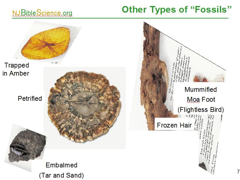 Now just to expand our thinking a bit, there are other ways that preservation may take place. Shown here is an insect trapped in amber (a tree sap substance), petrifaction, embalming, freezing and mummification. But this are much less frequent than permineralization fossils.