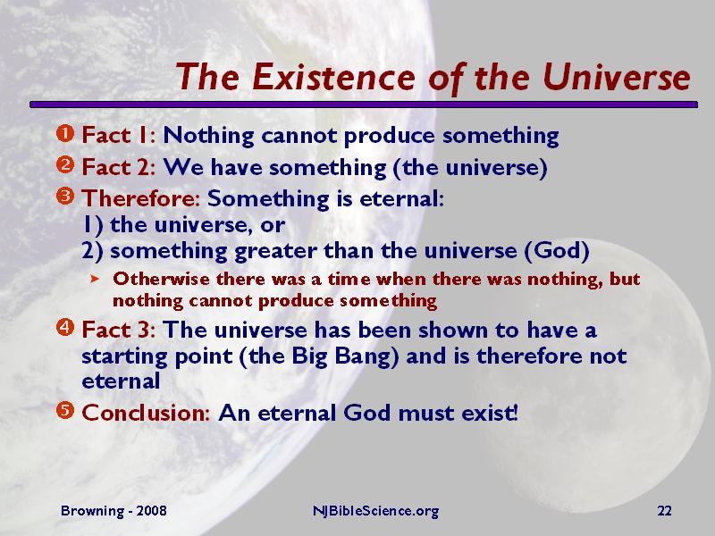 This is one of the traditional arguments for the existence of God. The fact that something exists today means that something is eternal, for if there ever was a time when there was nothing, then we would still have nothing today, as something cannot come from nothing. The only two options for what can be eternal are the universe itself or something outside of and greater than the universe. And since we now know that the universe is not eternal, it must be the something outside of and greater than the universe, namely God, that is eternal.