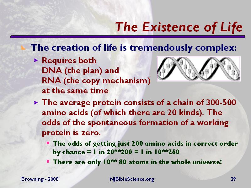 The complexity of life is daunting, as a simple calculation of the odds for forming a working protein by chance in a hypothetical bath of amino acids shows. This level of complexity was vividly described by Fred Hoyle, proponent and defender of the steady-state theory of the universe, who said that a living organism emerging by chance from a pre-biotic soup is about as likely as “a tornado sweeping through a junkyard might assemble a Boeing 747 from the materials therein.”