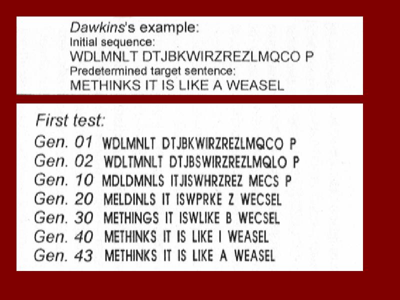 Here is an example of cumulative selection in operation. We start with a random sequence of letters (representing existing or random potential information). We have a target, in this case the sentence “methinks it is like a weasel” (representing the information for some new beneficial feature, like a body organ or a wing). In each generation the existing phrase is ‘breed’ – duplicated with a certain chance of random error in the copying (‘mutations’ are introduced). The ‘progeny’ of the original phrase are examined and the one which most closely resembles the target phrase, however slightly, is kept as the starting point for the next generation (mimicking the process of natural selection).