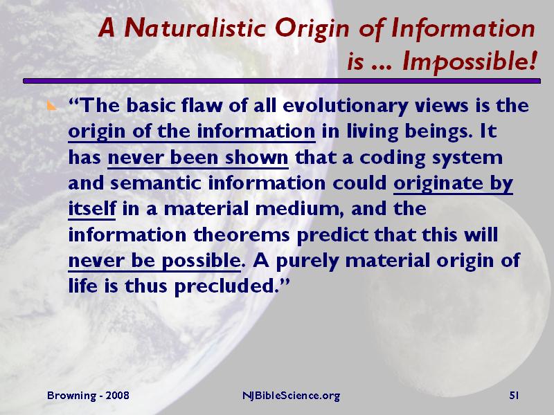 Professor Gitt is saying that any evolutionary view must account for the origin of the information of life, but it has never been demonstrated that information can be produced via an evolutionary (unguided physical) process. He further states that not only has it not been demonstrated, but that it never could be demonstrated, as the theorems he outlines in his book predict it cannot happen.