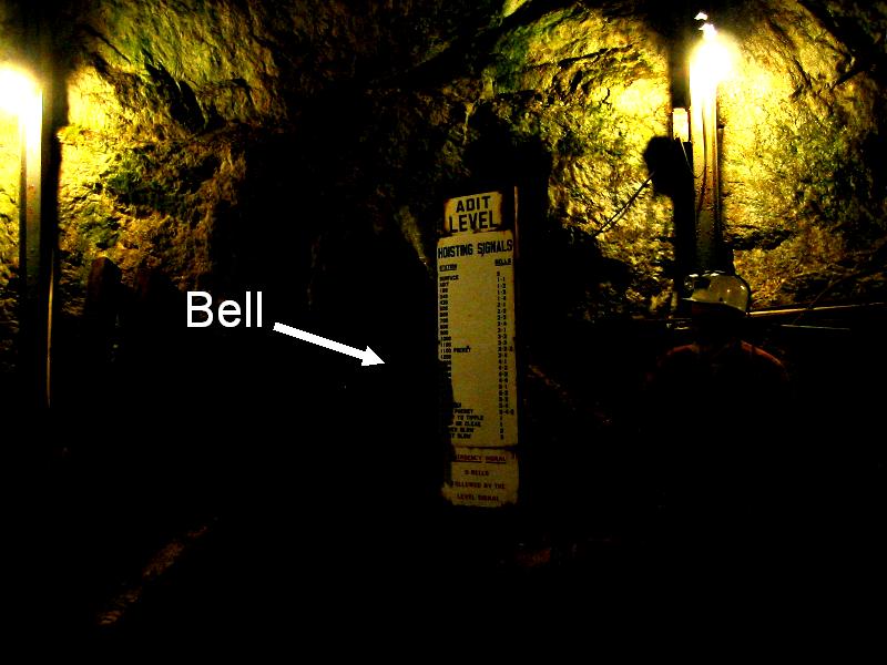The hoistman and crew used a series of bell tones to signal to each other throughout the mine levels to run men and/or equipment to various levels of the mine.
