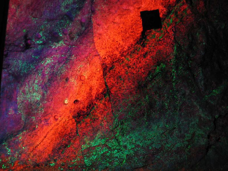 Photo: Calcite (red) and willemite (green) fluorescing under ultraviolet light in wall rock along the Sterling Hill mine tour.