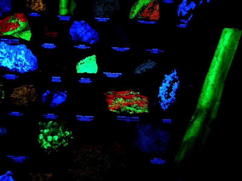 Calcite – upper middle left –fluoresces a creamy bluish color (not just red orange) – Some calcite does not flouresce